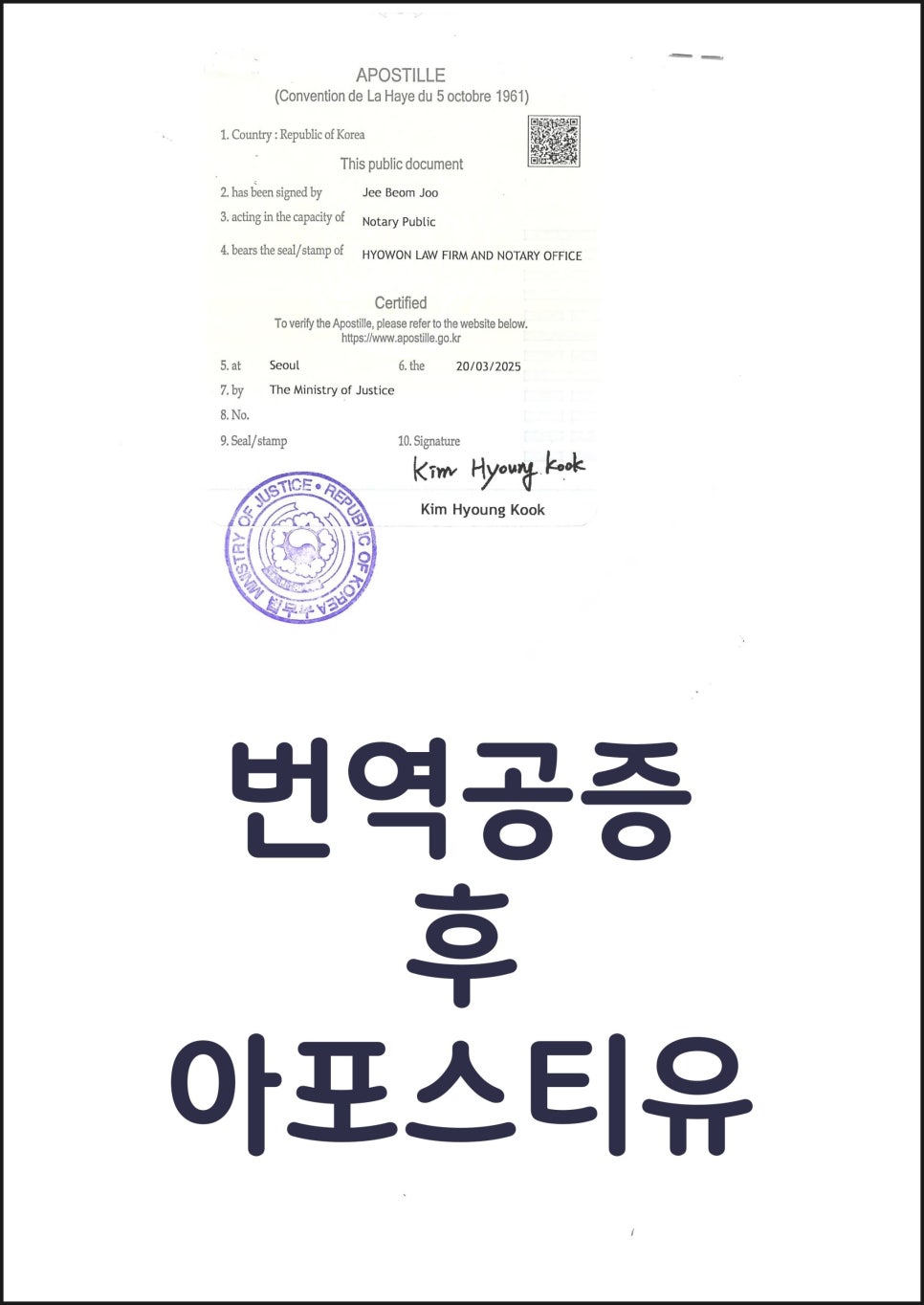 ✅ 절차 간소화: 외교부 또는 법무부의 아포스티유 인증만으로 충분합니다.