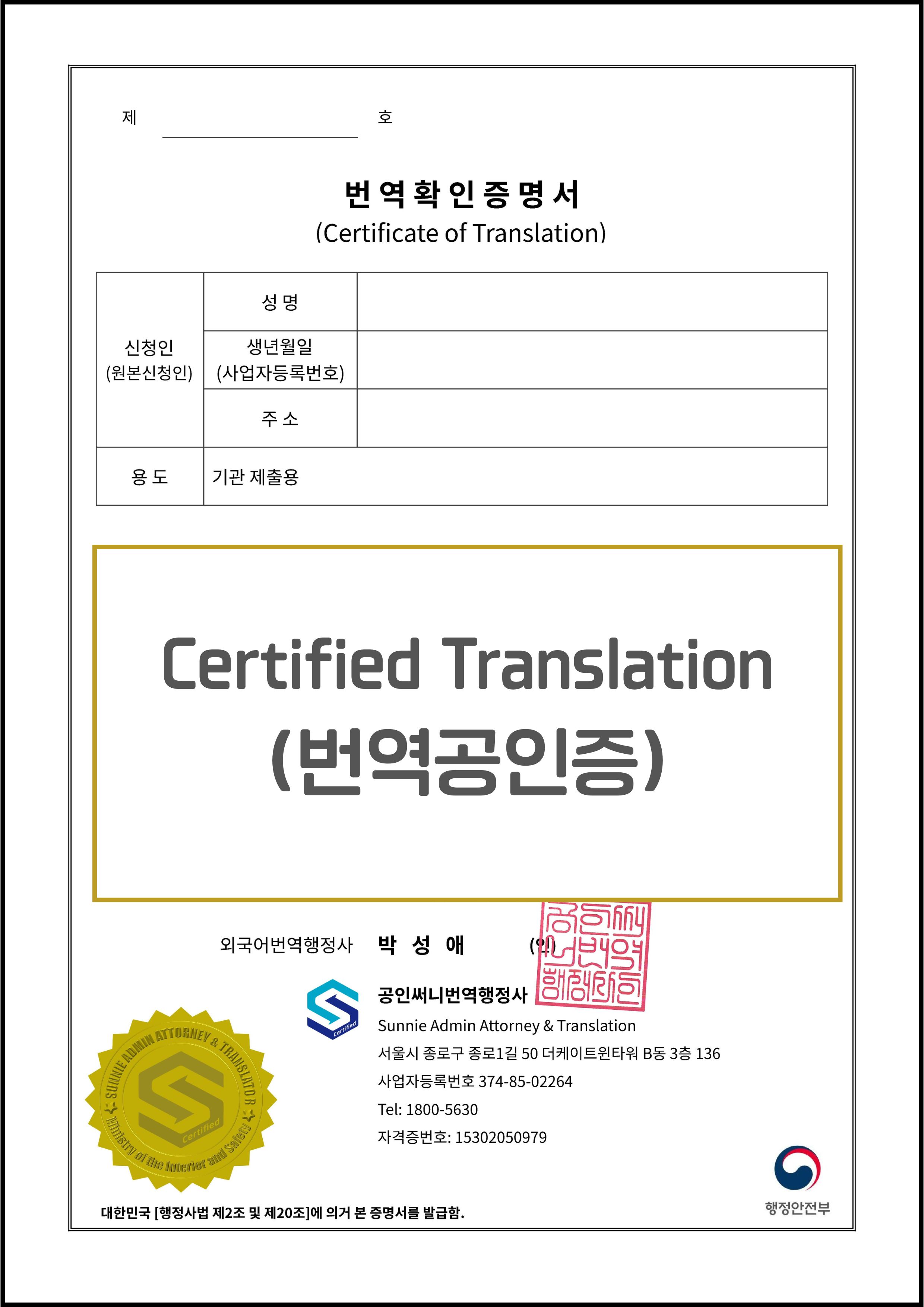 이유 2: 정확성과 전문성 한국 제출처의 성격에 맞는 정확한 행정 용어 번역은 한국의 '외국어번역행정사'가 가장 전문적입니다.