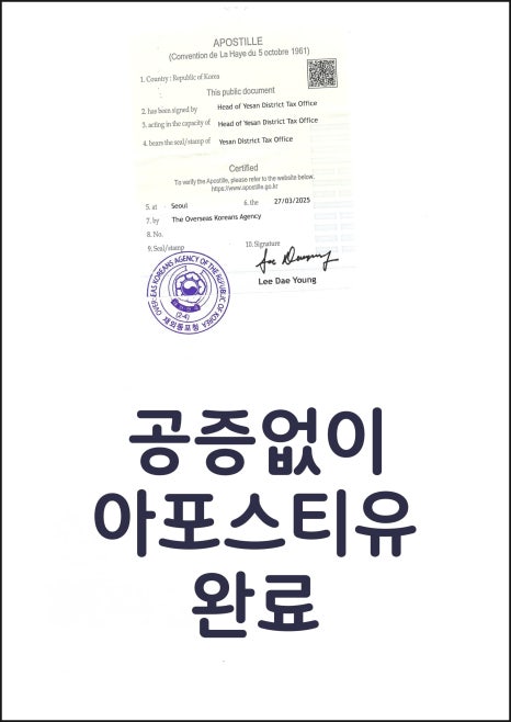 ✅ 절차 간소화: 외교부 또는 법무부의 아포스티유 인증만으로 충분합니다.